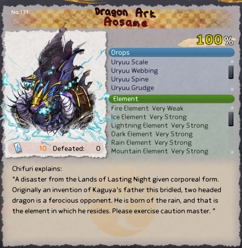 "A disaster from the Lands of Lasting Night given corporeal form. Originally an invention of Kaguya's father this bridled, two headed dragon is a ferocious opponent. He is born of the rain, and that is the element in which he resides. Please exercise caution master."