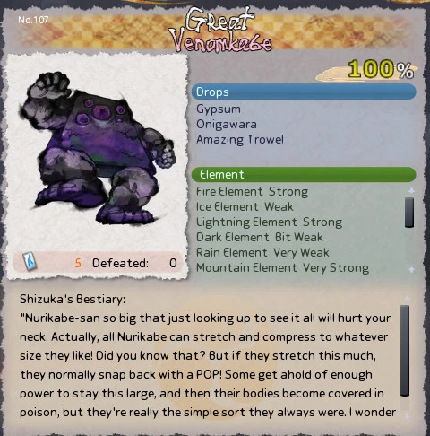 "Nurikabe-san so big that just looking up to see it all will hurt your neck. Actually, all Nurikabe can stretch and compress to whatever size they like! Did you know that? But if they stretch this much, they normally snap back with a POP! Some get ahold of enough power to stay this large, and then their bodies become covered in poison, but they're really the simple sort they always were. I wonder what it would be like to be friends with one..."