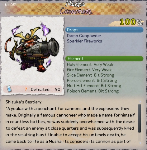 "A youkai with a penchant for cannons and the explosios they make. Originally a famous cannoneer who made a name for himself in countless battles, he was suddenly overwhelmed with the desire to defeat and enemy at close quarters and was subsequently killed in the resulting blast. Unable to accept his untimely death, he came back to life as a Musha. It considers its cannon as part of its body, and stealing it would make it lose its will to live and they'll pass on, or so they say...Good time for a funeral salute."