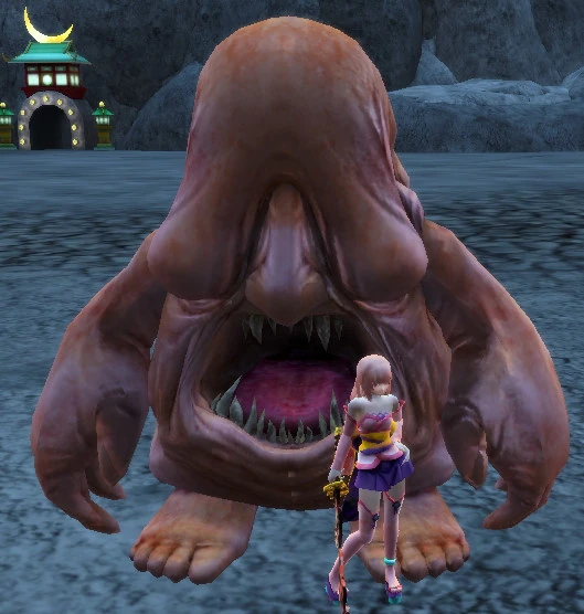 "A youkai that uses its large, flabby body to attack. Its breath reeks so badly of rotten meat that it's not uncommon to pass out from the smell alone. It's said that they're the result of priests who were forbidden from enjoying worldly foods or women who believed they were too fat. Anyways, they're the result of worrying to much about food. A food grudge sure is scary, I'd better be careful."