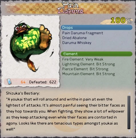 "A youkai that will roll around and writhe in pain at even the lightest of attacks. It's almost painful seeing their bitter faces as they hop towards you. When fighting, they show a lot of willpower as they keep attacking even while their faces are contorted in agony. Looks like there are tenacious types amongst youkai as well!"