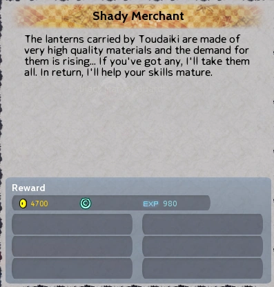 This quest is popular to complete due to the constant amount of experience and ryou gained through completion and the close proximity to Toudaiki which drop the Broken Lanterns required for completion.